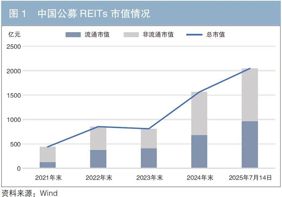 在稳步发行的大背景下,REITs市场持续扩围扩容。万得(Wind)统计数据显示(下同),2024年,我国境内新发行REITs产品29只,创年度发行数量历史最高纪录,反映出市场活跃度与发行效率都显著提升。截至2025年7月14日,已发行REITs项目数量增加到73个,覆盖10大类资产。从市场表现看,在6月5日,我国境内公募REITs的总市值首次突破2000亿元,标志着市场规模进入了新的发展阶段,整体发展态势持续向好(见图1)。